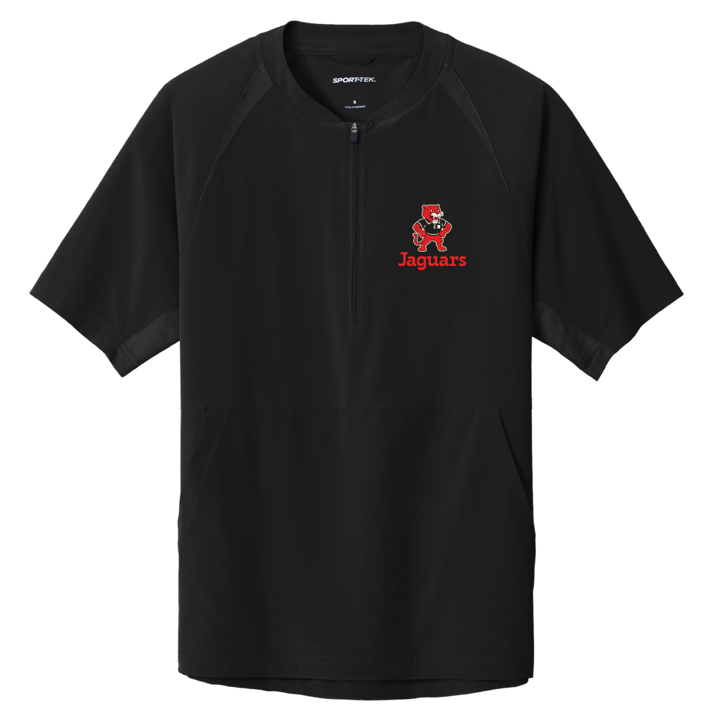 Featuring a 1/4-zip front, short raglan sleeves, and a drop tail hem, the jacket is built for breathability and movement. The standout embellishment is a Direct-to-Film (DTF) transfer of the bold red Jaguars mini mascot, adding sharp color and detail on the left chest.