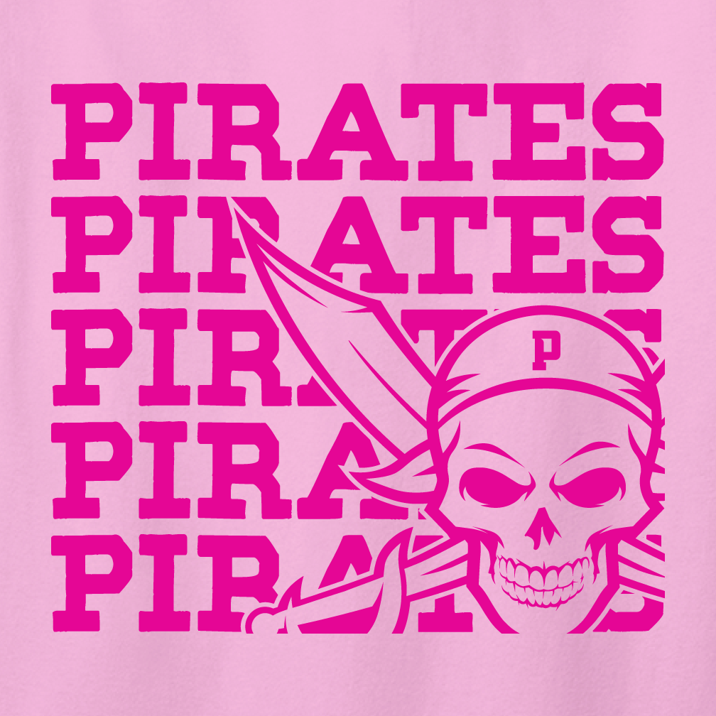 This soft, 100% cotton pink t-shirt features a bold, screen-printed Pirate mascot design repeated for maximum impact. Perfect for Breast Cancer Awareness events or everyday wear, it’s a stylish way to stand with the community and show your support.